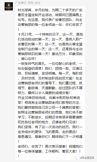 合作共贏,共創(chuàng)輝煌!主動營銷22天以來實地助力廣安贏在終端,取得驕人成績,更加堅定了經(jīng)銷商做奢匠品牌的決心。為感謝公司總部對廣安的支持!感謝以文經(jīng)理為首的主動營銷戰(zhàn)隊的辛苦付出!活動結(jié)束后,廣安奢匠店面負責(zé)人特意寫了感謝信表達謝意。以下是廣安奢匠店面負責(zé)人活動感言。