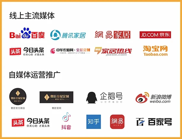 奢匠全面構(gòu)筑品牌立體化傳播矩陣,與騰訊家居、慧亞家居熱線、中華衣柜網(wǎng)等權(quán)威媒體平臺(tái)達(dá)成戰(zhàn)略合作;同時(shí)奢匠廣告已于央視、電臺(tái)、城市核心商圈LED屏、高速路牌、高鐵站等全方位登陸;搭建以品牌官網(wǎng)、官方微信公眾號、微博、淘寶旗艦店、京東旗艦店、抖音號等平臺(tái)為核心的品牌自媒體矩陣。實(shí)現(xiàn)宣傳渠道全網(wǎng)覆蓋,為品牌推廣賦能,提升品牌影響力。