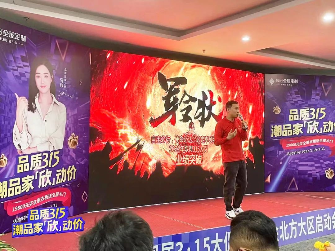 緊接著,由奢匠家居北方大區(qū)經(jīng)理—劉昊先生上臺(tái)進(jìn)行分享。他首先就2021年度工作進(jìn)行總結(jié),再圍繞“2022年銷(xiāo)售目標(biāo)—柜類(lèi)翻倍,櫥柜100%配套”對(duì)北方大區(qū)工作進(jìn)行動(dòng)員部署。他講到:“2021年,在北區(qū)家人們不懈努力下,我們用業(yè)績(jī)拿下了2021年的勝利。在嶄新的2022年,期望北方家人們能夠凝心聚力,團(tuán)結(jié)共進(jìn),不斷增強(qiáng)自身實(shí)力,勢(shì)必再次拿下全公司業(yè)績(jī)指標(biāo)第一名。”