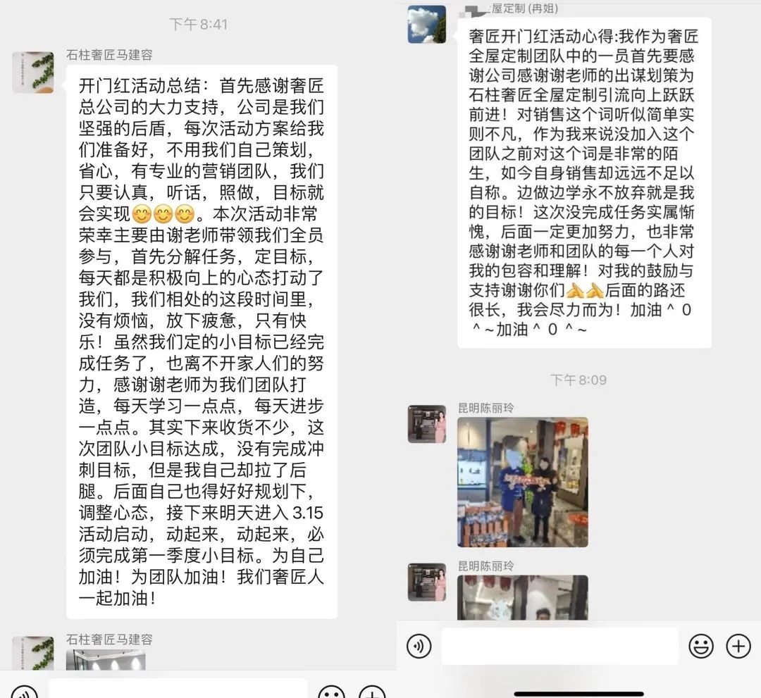 自開(kāi)門紅戰(zhàn)役在重慶石柱縣打響以來(lái),總部全面貫徹“強(qiáng)終端,重幫扶的核心理念“,主動(dòng)營(yíng)銷謝斌、郭新心兩位老師在特殊時(shí)期趕赴奢匠石柱門店進(jìn)行全方位活動(dòng)幫扶。在活動(dòng)開(kāi)展期間,奢匠石柱門店團(tuán)隊(duì)斗志滿滿,100%沖刺業(yè)績(jī)。最終在兩位老師的帶領(lǐng)下,團(tuán)隊(duì)的共同努力下,斬獲單27單,收定金15.6萬(wàn),預(yù)計(jì)銷售額高達(dá)90萬(wàn),一舉斬獲佳績(jī)!