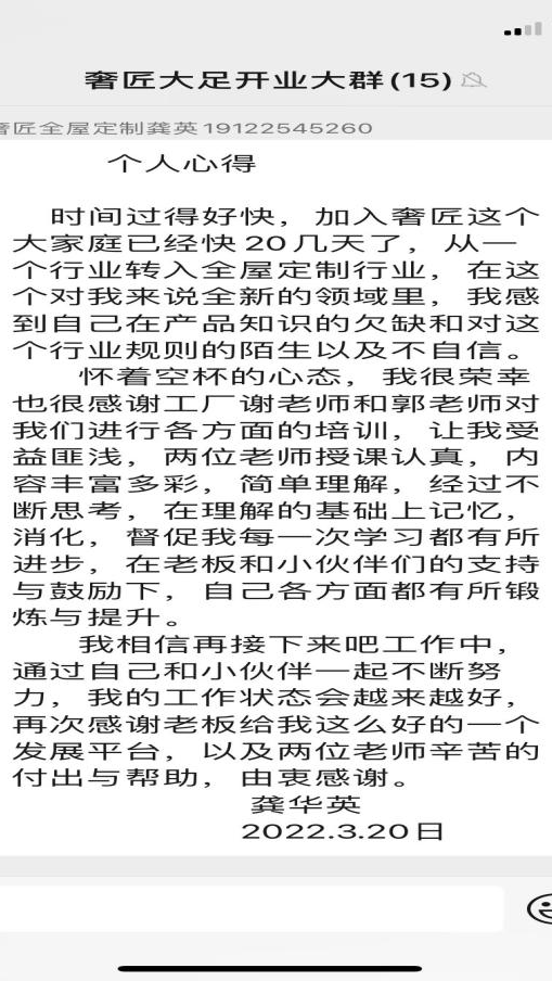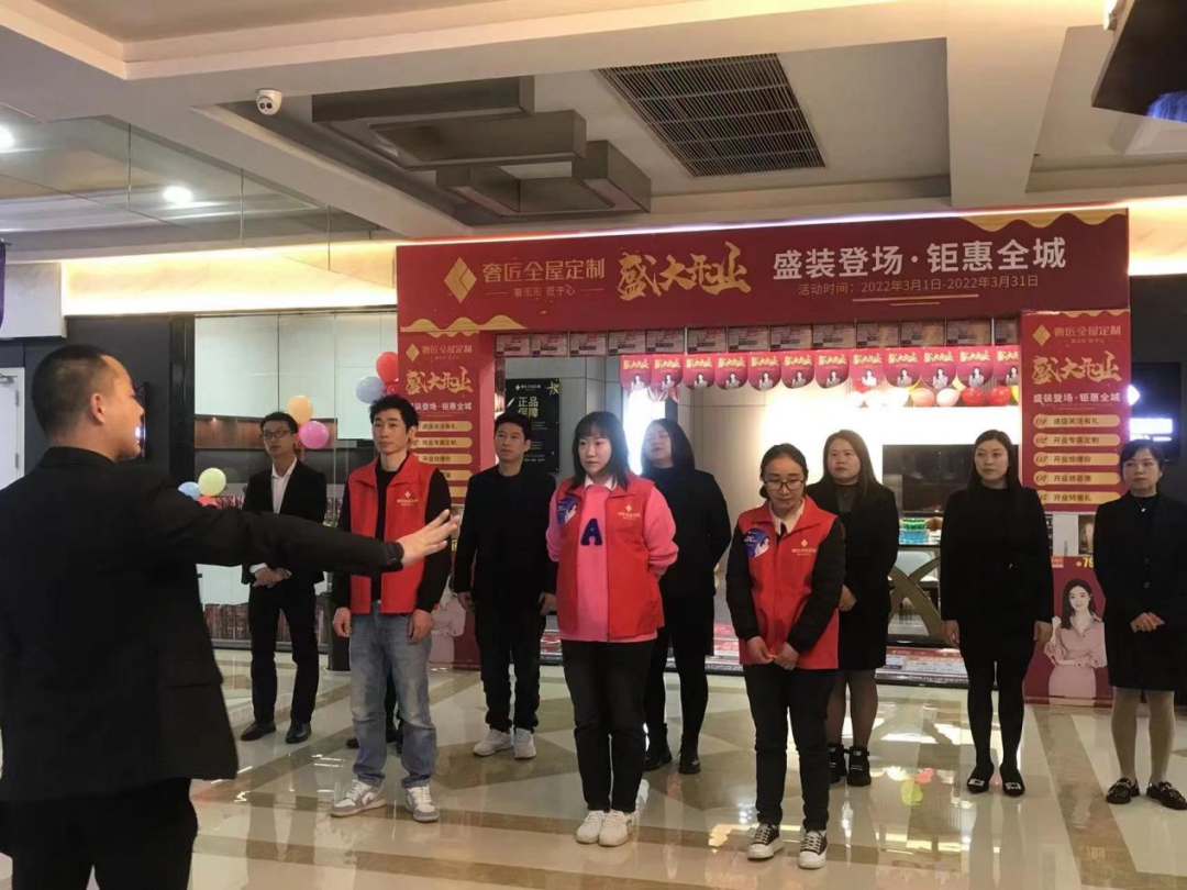 為推進(jìn)大足奢匠經(jīng)銷商門店的快速發(fā)展,在315大促活動(dòng)中斬獲佳績。謝老師帶領(lǐng)大足奢匠團(tuán)隊(duì)共同開展活動(dòng)各項(xiàng)工作,根據(jù)大足市場(chǎng)趨勢(shì)制定活動(dòng)目標(biāo)。堅(jiān)持每天開展晨會(huì),以口號(hào)、舞蹈、游戲等方式調(diào)動(dòng)積極性,鼓舞士氣;以及進(jìn)行日行動(dòng)承諾、優(yōu)秀者分享經(jīng)驗(yàn)等行動(dòng),以此開展一天高效的工作。
