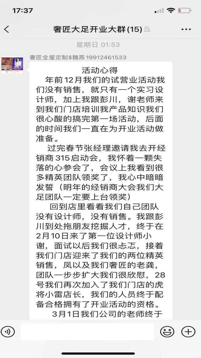 在活動(dòng)期間,為了促進(jìn)大足團(tuán)隊(duì)的快速成長,主動(dòng)營銷謝老師專門建立“品質(zhì)315大促開業(yè)活動(dòng)群”。并規(guī)定,店內(nèi)成員都需將當(dāng)天的工作成果與心得在群內(nèi)進(jìn)行發(fā)布,達(dá)到相互督促,相互成長的目的。