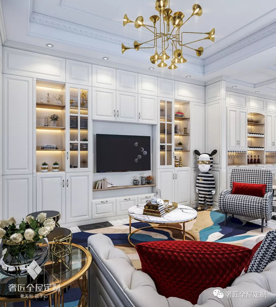 客廳采用和煦的白色作為主色調(diào),給人一種高級的溫馨感??蛷d視聽柜充分考慮收納功能及裝飾性,整墻內(nèi)嵌式柜體將整個(gè)墻面覆蓋,既可收納物品,也可充當(dāng)背景墻,滿足居室收納需求的同時(shí),讓客廳成為一道獨(dú)特的風(fēng)景線。