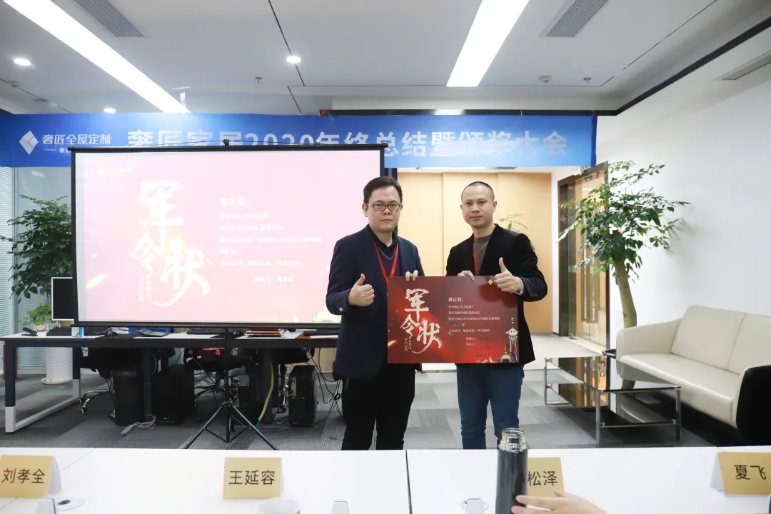 2021年1月30日,奢匠2020年終總結暨頒獎大會于奢匠營銷中心舉行。奢匠家居總裁王延容、總經理蔣松澤、營銷副總劉孝全、各部門負責人及營銷中心全體人員參加了此次會議。