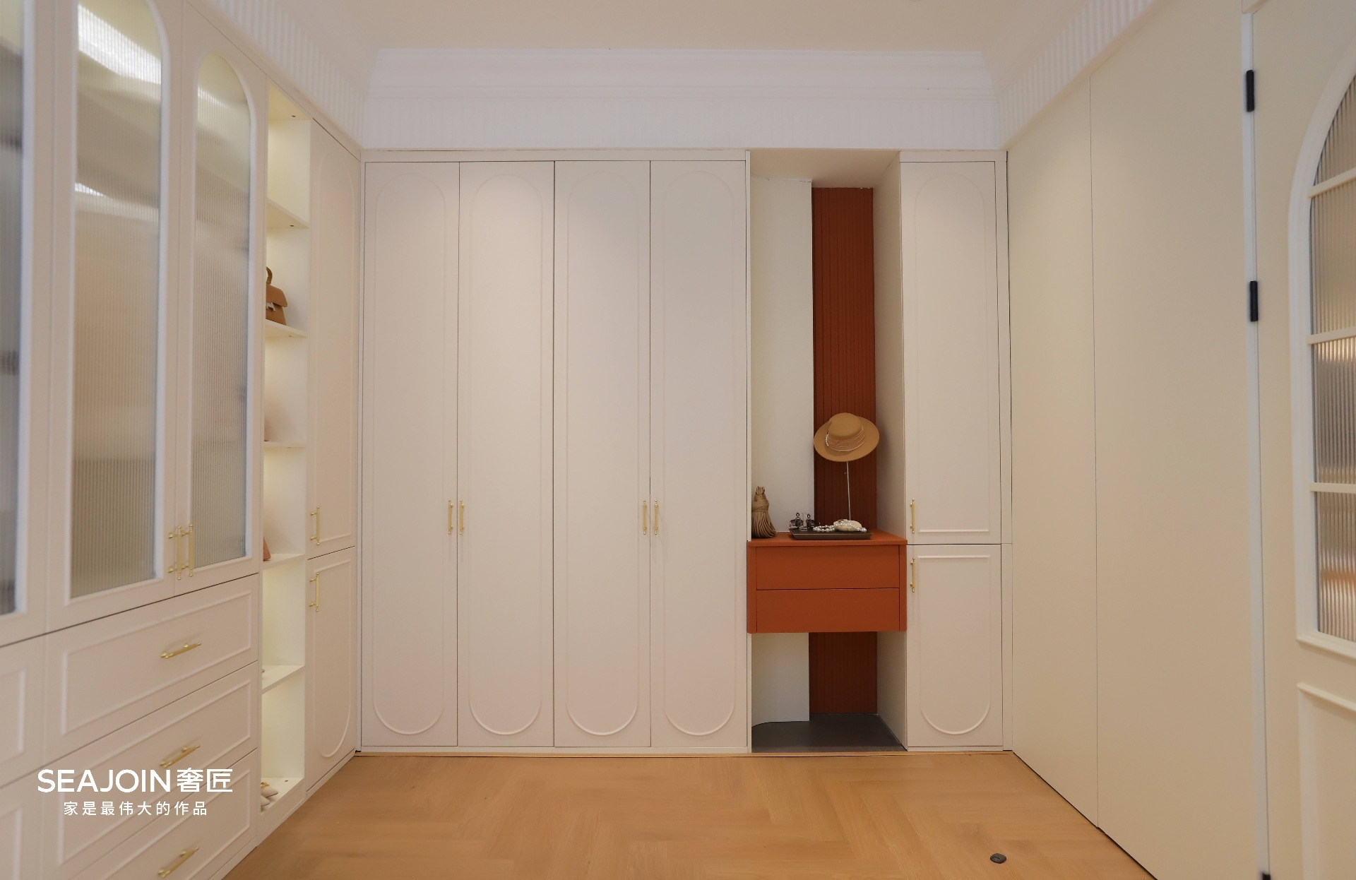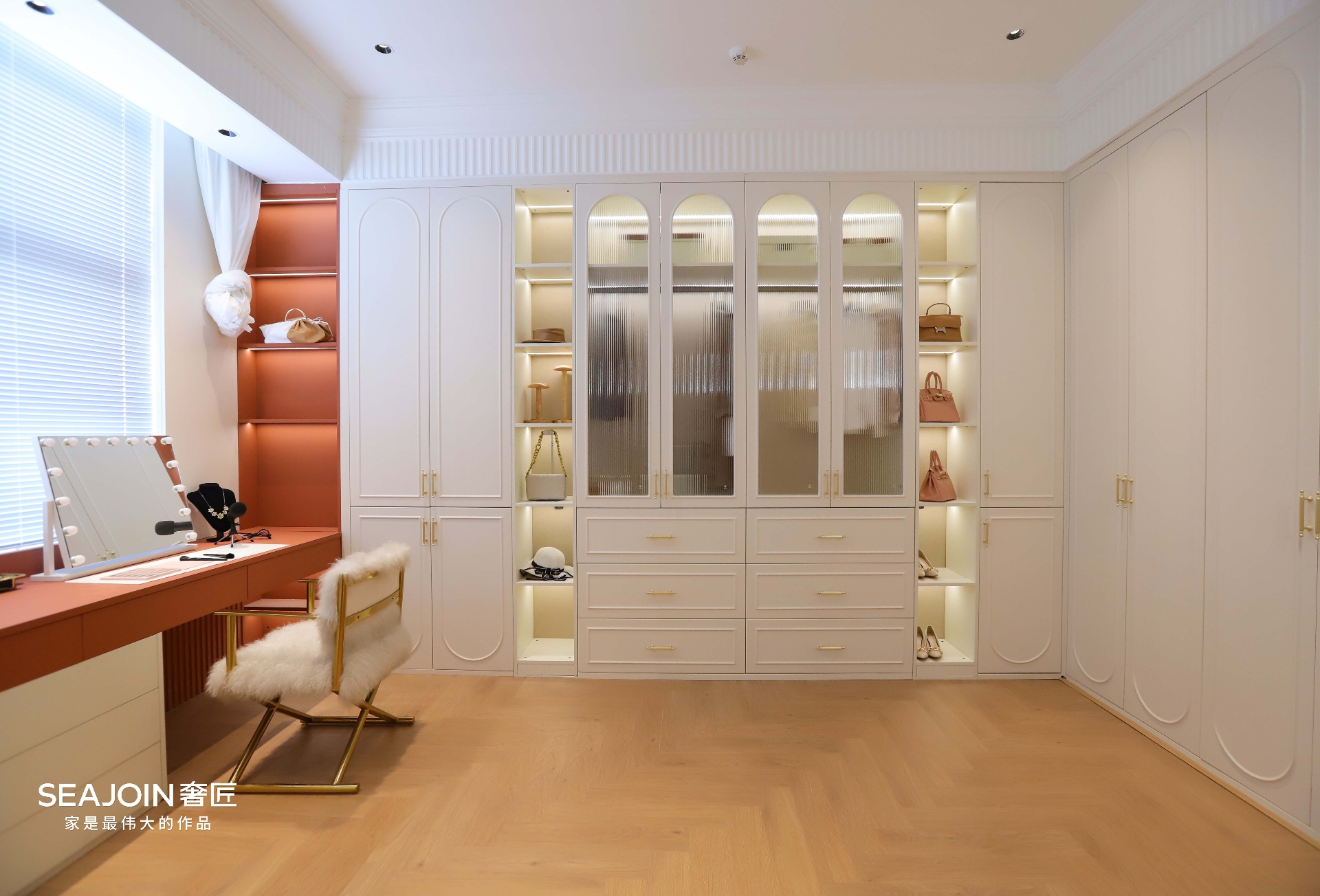 衣柜玻璃元素的使用,帶來(lái)極強(qiáng)的通透感。嵌入的氛圍燈和金色小拉手點(diǎn)綴,烘托出法式衣柜的優(yōu)雅與格調(diào),在色彩的組合下,溫柔氣息彌漫空間。