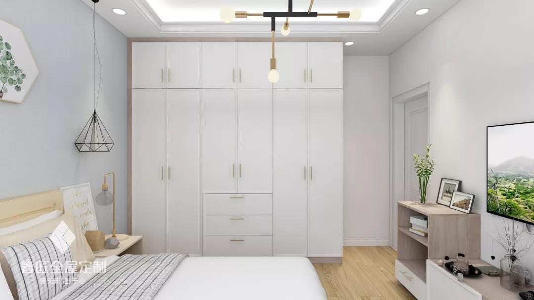 不同的材質與不同的色彩搭配,能夠營造不同的感覺,將臥室家具以同一種色調展現出來,產生一種與眾不同的效果。白色背景墻、白色置頂衣柜以及白色棉質床品,以純粹的白色塑造了統(tǒng)一的視覺效果,效果渾然一體,房間透亮不顯雜亂,有效地起到延展空間的作用。