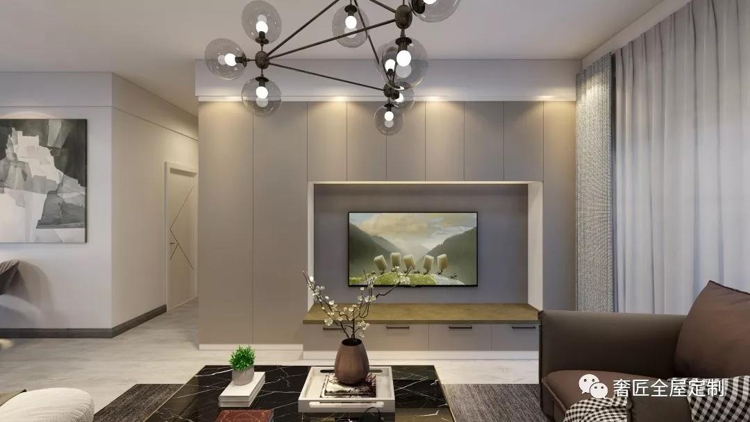 ·整墻式電視背景墻+收納柜,置物收納,減少空間占用率。