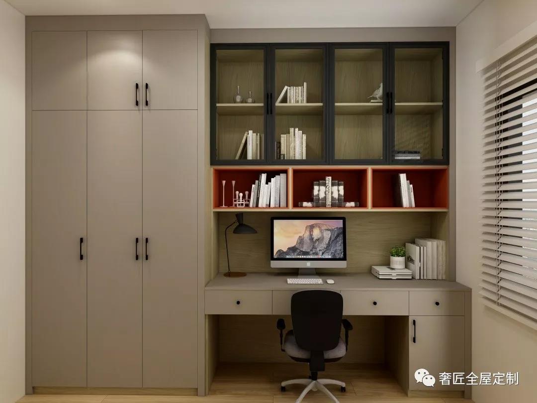 書(shū)房以柜子作為主體,采用蘇香桐+膚感灰兩種色調(diào),搭配鋁框玻璃柜門,凸顯書(shū)柜的超大內(nèi)容量,方便書(shū)籍分類存儲(chǔ)和取放。書(shū)桌、衣柜能夠滿足日常收納,衣柜可以作為多功能柜使用,不僅能夠存放衣柜,同時(shí)也可存放小孩的書(shū)本、書(shū)包等物品;書(shū)桌長(zhǎng)而寬,能夠存放最近常用的書(shū)籍。而書(shū)房?jī)?nèi)的原木地板給人以舒適優(yōu)雅之感,營(yíng)造出良好的讀書(shū)、辦公氛圍。