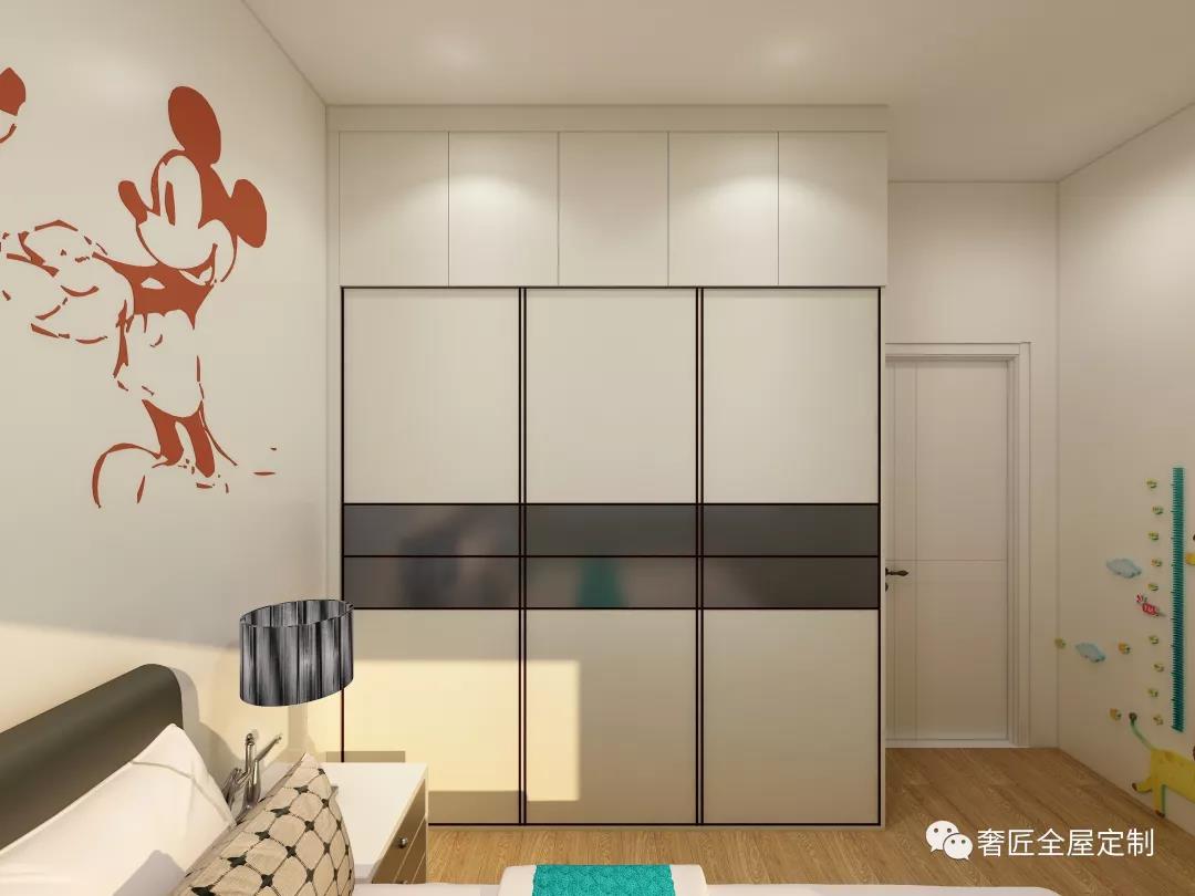 兒童房的設(shè)計(jì)在元素和色彩的運(yùn)用上更加多元化,雨絲白柜體的推拉門使用上更加輕巧安全,十分簡(jiǎn)便,非常適合兒童使用。同時(shí),深藍(lán)色條紋床頭燈、極具個(gè)性的格子枕頭、墻壁上的大幅米奇貼紙和富有童趣的身高測(cè)量貼都為大篇幅的白色增添了樂(lè)趣和童真。