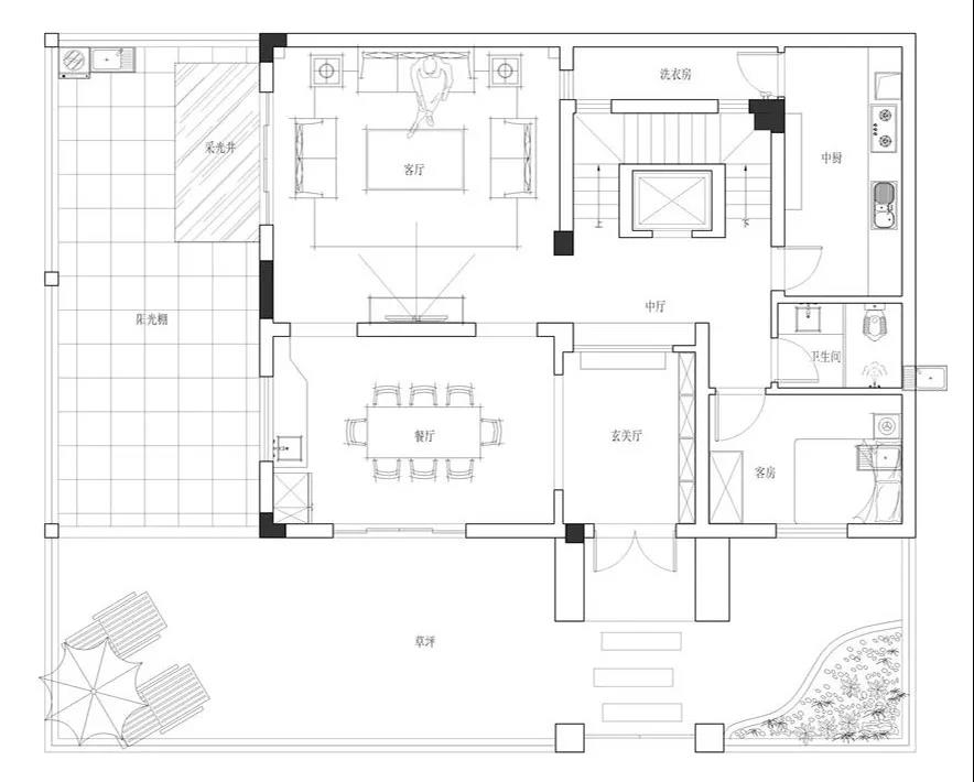 ·均衡對稱設(shè)計,結(jié)合中式回字元素,營造中式風(fēng)格。
