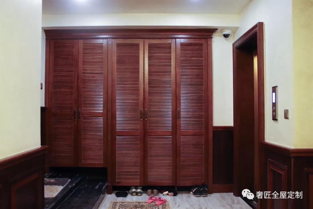 王女士家戶型比較大,三樓有一處室外露臺,因此在三樓通往戶外露臺的玄關(guān)處放置一個鞋柜,可方便進(jìn)出時換鞋、掛衣和存放臨時物品,鞋柜以簡約的柜體造型為基礎(chǔ),增添了中式元素,使整體空間感覺更加豐富,大而不空、厚而不重,有格調(diào)又不顯壓抑。