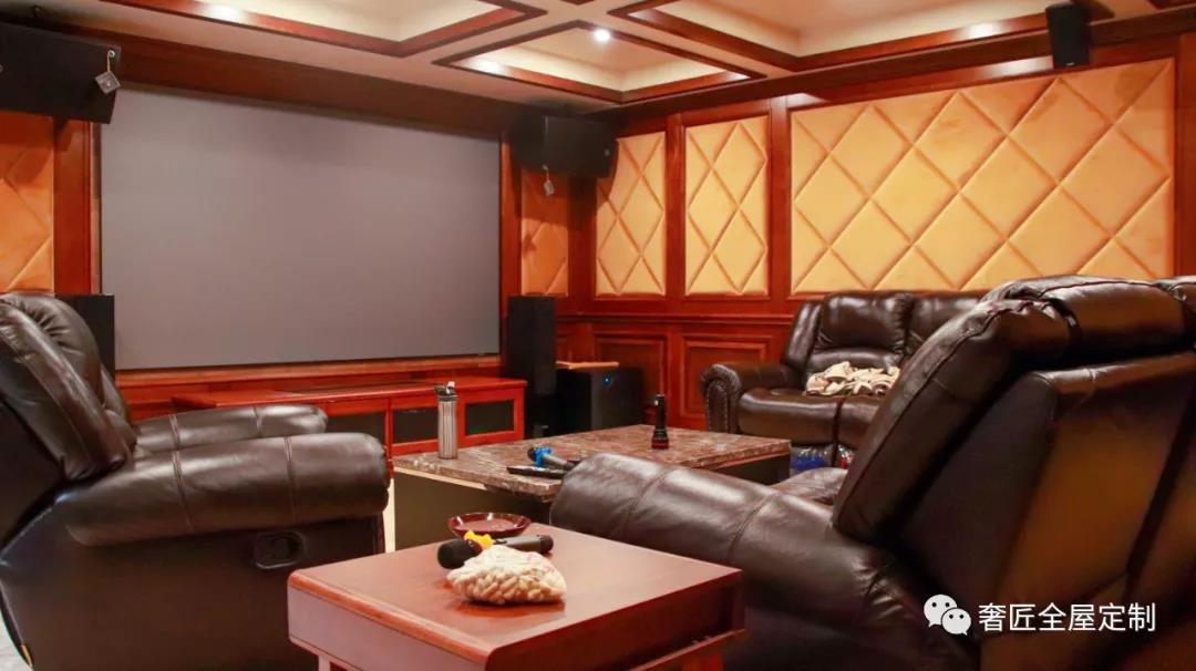 在家設(shè)影視廳,平時可作家用電影院,亦是獨立K歌房,位置設(shè)在負(fù)一樓,自帶隔音效果,完全不用擔(dān)心吵到家人休息。影視廳整體以深棕為基調(diào),背景墻采用軟包設(shè)計,搭配黑色皮質(zhì)沙發(fā)作為局部點綴,將富有古韻的胡桃木與時尚軟裝家居完美結(jié)合,打造視覺上的平衡感,以此演繹大氣典雅的東方韻味。