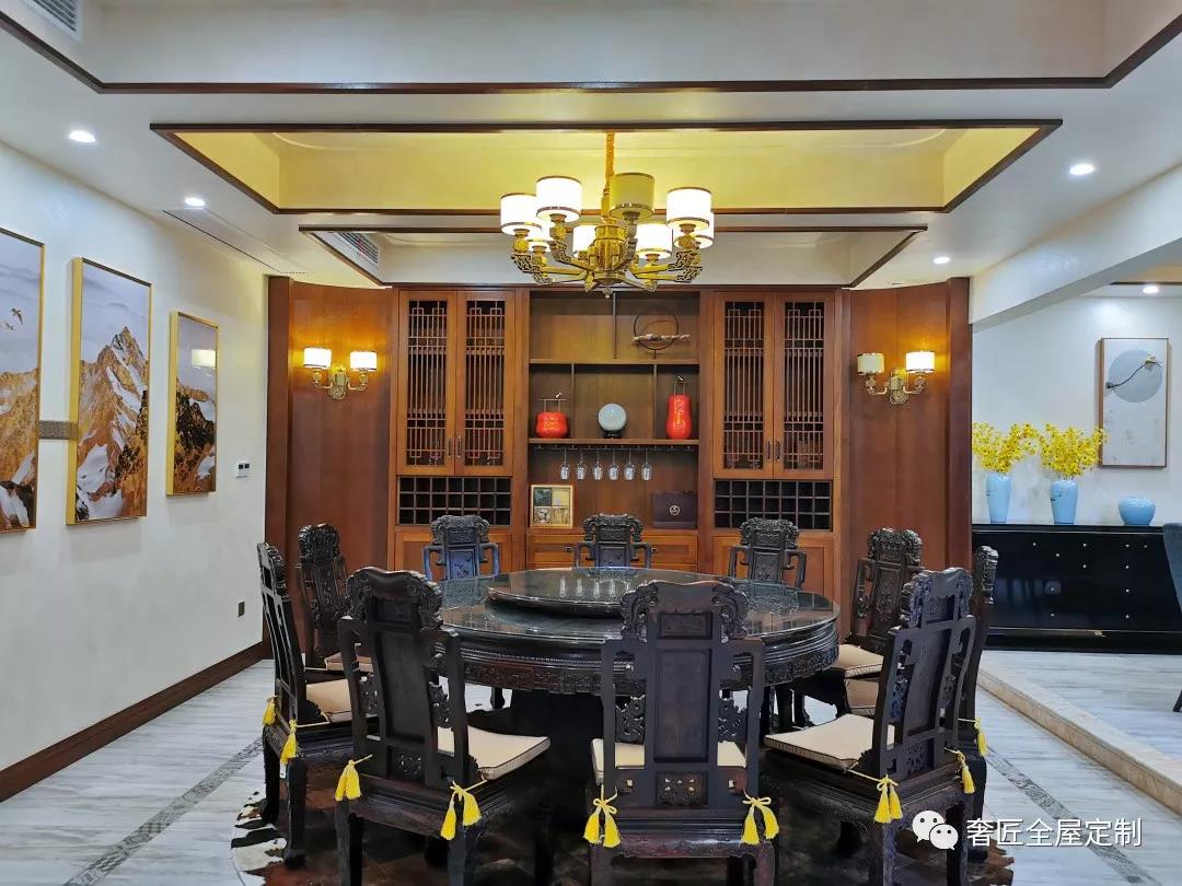 餐廳以整面墻作為餐邊柜和酒柜設(shè)計,與用餐區(qū)的大圓桌相呼應(yīng),濃濃古韻中滲透了幾許現(xiàn)代氣息。餐邊柜線條層次分明,呈現(xiàn)出對稱設(shè)計,具有較強(qiáng)的收納儲藏功能,還能裝飾餐廳,為生活提供便利的同時,也是空間中一道美麗的風(fēng)景線。